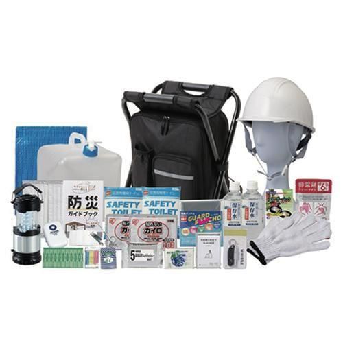 イス型リュック(撥水加工) /ヘルメット KGBo-1 ホワイト/2WAY ランタン(電池別売) /アルカリ保存水(500ml) × 2/ガードポンチョ/チャック付き袋/ウォータータンク(10L) /使い捨てカイロ× 2 /使い捨てマスク× 2 /非常用ウェットタオル/水に流せるポケットティッシュ/ウェットティッシュ( 5年保存) /静音アルミブランケット/携帯トイレ(5回分) × 2/非常用呼子笛(ID カード付き) /軍手/防災ガイドブック・ブルーシート/救急セット(エイドチーム2)